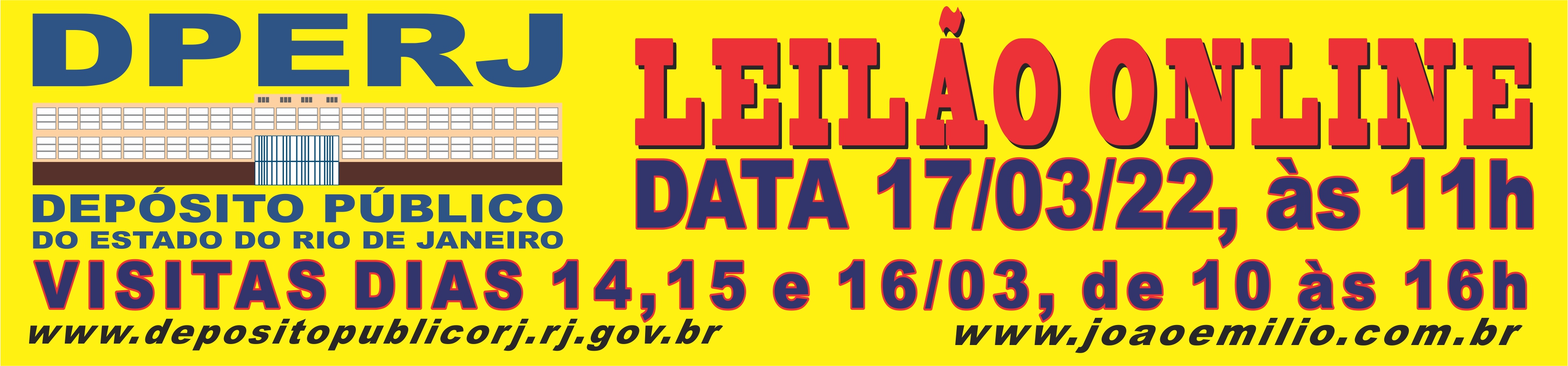 No dia 17 de Março de 2022 às 11h acontecerá o Leilão de Veículos e Materiais Diversos do DPERJ. A visitação acontecerá nos dias 14, 15 e 16 de Março de 2022 das 10 às 16h no DPERJ, respeitando às normas de higienização e distanciamento social, entrarão duas pessoas por vez, sendo obrigatório o uso de máscara.