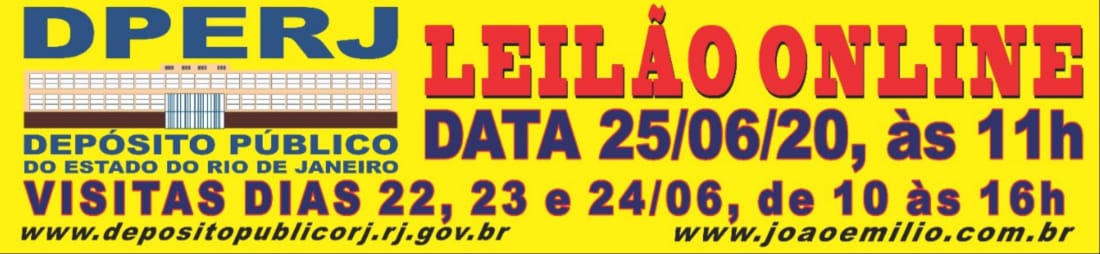 No dia 25 de Junho de 2020 às 11h acontecerá o Magnífico Leilão de bens do DPERJ. A visitação acontecerá nos dias 22, 23 e 24 de Junho de 2020 das 10 às 16h no DPERJ, respeitando às normas de higienização e distanciamento social, entrarão duas pessoas por vez, sendo obrigatório o uso de máscara.